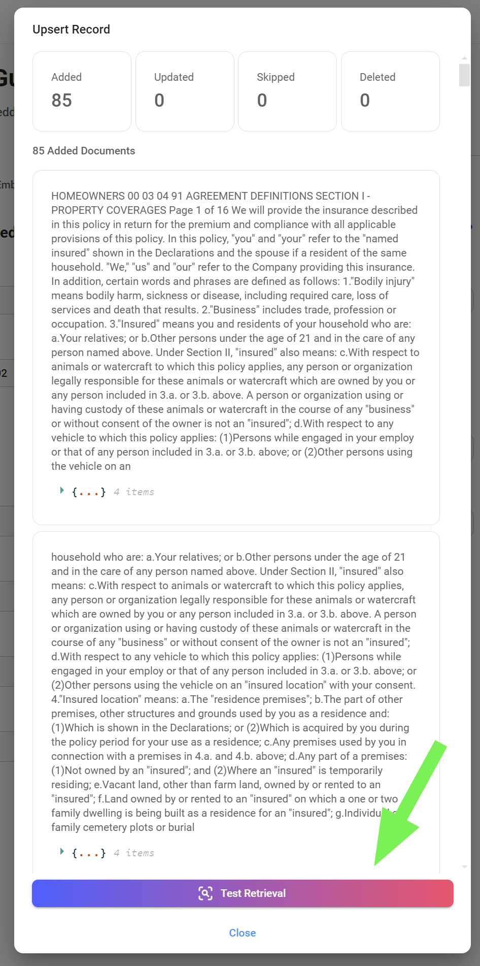 We started by creating a Document Store to organize the LibertyGuard Deluxe Homeowners Policy data. This data was then prepared by uploading, chunking, processing, and upserting it, making it ready for our RAG system.